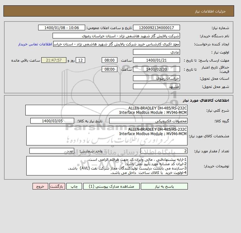 شرح کلی نیاز: ALLEN-BRADLEY DH-485/RS-232C Interface Modbus Module : MVI46-MCM