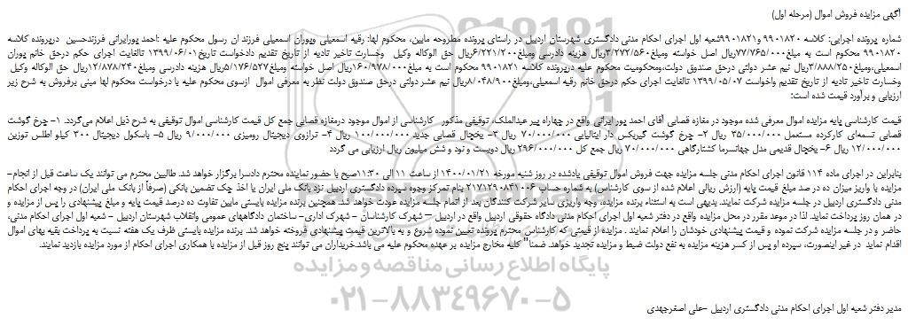 شماره پرونده اجرایی: کلاسه 9901820 و9901821شعبه اول اجرای احکام مدنی دادگستری شهرستان اردبیل در راستای پرونده مطروحه مابین، محکوم لها: رقیه اسمعیلی وپوران اسمعیلی فرزند ان رسول محکوم علیه :احمد پورایرانی فرزندحسین  درپرونده کلاسه 9901820 محکوم است به مبلغ77/765/000ریال اصل خواسته ومبلغ3/272/560ریال هزینه دادرسی ومبلغ6/221/200ریال حق الوکاله وکیل  وخسارت تاخیر تادیه از تاریخ تقدیم دادخواست تاریخ1399/06/01 تالغایت اجرای حکم درحق خانم پوران اسمعیلی،ومبلغ3/888/250ریال نیم عشر دولتی درحق صندوق دولت،ومحکومیت محکوم علیه درپرونده کلاسه 9901821 محکوم است به مبلغ160/978/000ریال اصل خواسته ومبلغ5/176/527ریال هزینه دادرسی ومبلغ12/878/240ریال حق الوکاله وکیل  وخسارت تاخیر تادیه از تاریخ تقدیم واخواست 1399/05/07 تالغایت اجرای حکم درحق خانم رقیه اسمعیلی،ومبلغ8/048/900ریال نیم عشر دولتی درحق صندوق دولت نظر به معرفی اموال  ازسوی محکوم علیه با درخواست محکوم لها مبنی برفروش به شرح زیر ارزیابی و برآورد قیمت شده است؛