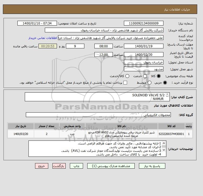 نام دستگاه خریدار:شرکت پالایش گاز شهید هاشمی نژاد - استان خراسان رضوی