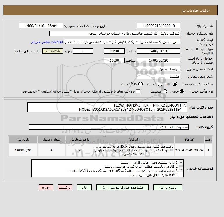 شرح کلی نیاز: FLOW TRANSMITTER , MFR:ROSEMOUNT