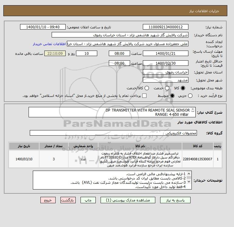 نام دستگاه خریدار:شرکت پالایش گاز شهید هاشمی نژاد - استان خراسان رضوی
