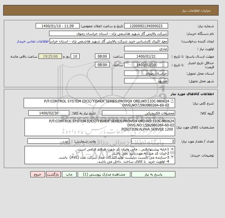 شرح کلی نیاز: P/F:CONTROL SYSTEM (DCS)"FISHER"SERIES:PROVOX ORD.NO:133C-980624 DWG.NO:159U980264-60-02 POSITION:ALPHA SERVER 1200