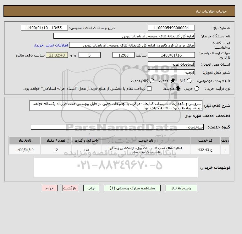 شرح کلی نیاز: سرویس و نگهداری تاسیسات کتابخانه مرکزی با توضیحات دقیق در فایل پیوستی-مدت قرارداد یکساله خواهد بود-تسویه به صورت ماهانه خواهد بود