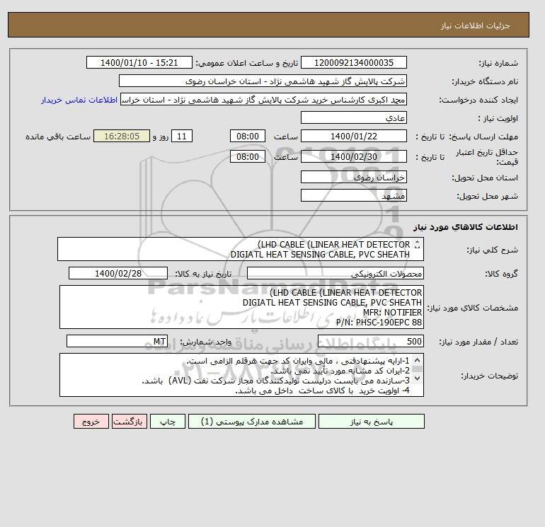 نام دستگاه خریدار:شرکت پالایش گاز شهید هاشمی نژاد - استان خراسان رضوی