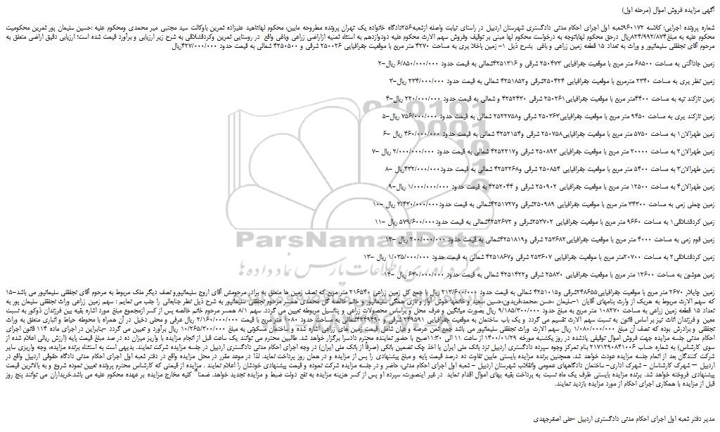 شماره پرونده اجرایی: کلاسه 960172شعبه اول اجرای احکام مدنی دادگستری شهرستان اردبیل در راستای نیابت واصله ازشعبه256دادگاه خانواده یک تهران پرونده مطروحه مابین، محکوم لها:ناهید علیزاده ثمرین باوکالت سید مجتبی میر محمدی ومحکوم علیه :حسین سلیمان پور ثمرین محکومیت محکوم علیه به مبلغ824/992/874ریال درحق محکوم لهاباتوجه به درخواست محکوم لها مبنی بر توقیف وفروش سهم الارث محکوم علیه دودوازدهم به استثاء ثمنیه ازاراضی زراعی وباغی واقع در روستایی ثمرین وکردقشلاقی به شرح زیر ارزیابی و برآورد قیمت شده است؛ ارزیابی دقیق اراضی متعلق به مرحوم آقای نجفقلی سلیمانپور و وراث به تعداد 15 قطعه زمین زراعی و باغی بشرح ذیل 1- زمین پاخلا یری به مساحت 4270 متر مربع با موقعیت جغرافیایی 250026 شرقی و 4250500 شمالی به قیمت حدود 427/000/000ریال