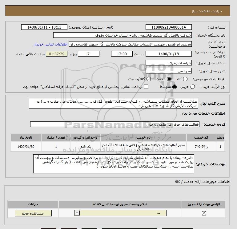 شرح کلی نیاز: عبارتست از انجام عملیات سمپاشی و کنترل حشرات، طعمه گذاری ............(موش، مار، عقرب و ...) در شرکت پالایش گاز شهید هاشمی نژاد