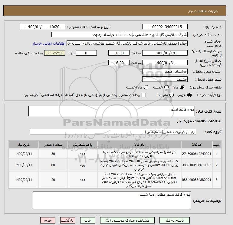 شرح کلی نیاز: پتو و کاغذ نسوز