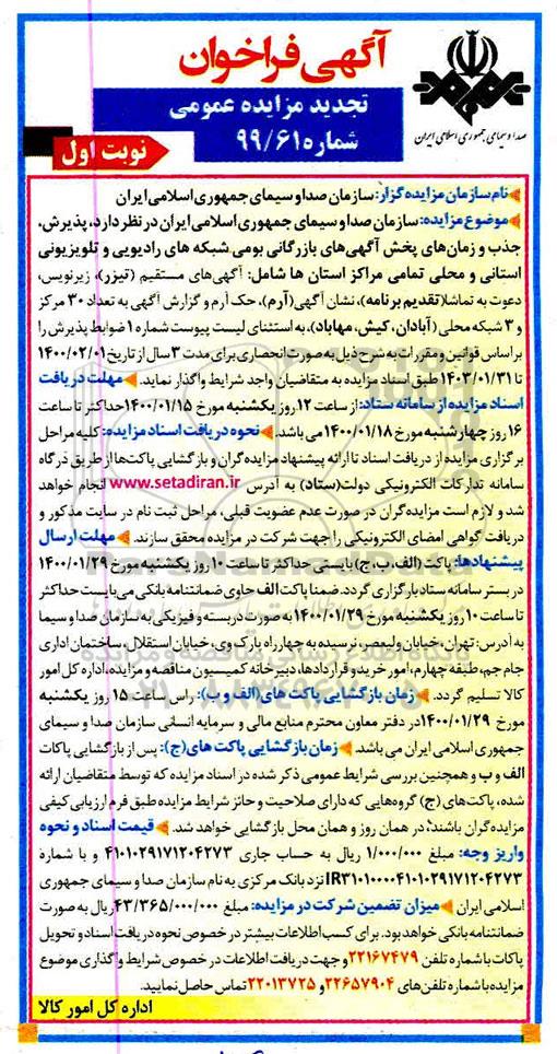 موضوع مزایده: سازمان صدا و سیمای جمهوری اسلامی ایران در نظر دارد پذیرش جذب و زمان بخش آگهی های بازرگانی بومی شبکه های رادیویی و تلویزیونی استانی و محلی تمامی مراکز استان ها شامل آگهی مستقیم (تیزر)، زیرنویس دعوت به تماشا (تقدیم برنامه) نشان آگهی (آرم)، حک آرم و گزارش آگهی به تعداد 30 مرکز و سه شبکه محلی (آبادان، کیش، مهاباد) به استثنای لیست پیوست شماره 1 ضوابط پذیرش را بر اساس قوانین و مقررات به شرح ذیل به صورت انحصاری برای مدت سه سال از تاریخ 1400.2.1 تا 1403.1.31 طبق اسناد مزایده به متقاضیان واجد شرایط واگذار نماید