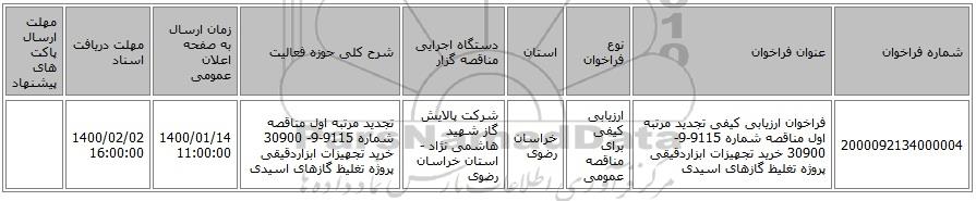 مناقصه، فراخوان ارزیابی کیفی تجدید مرتبه اول مناقصه شماره 9115-9- 30900 خرید تجهیزات ابزاردقیقی پروژه تغلیظ گازهای اسیدی, فراخوان ارزیابی کیفی تجدید مرتبه اول مناقصه شماره 9115-9- 30900 خرید تجهیزات ابزاردقیقی پروژه تغلیظ گازهای اسیدی