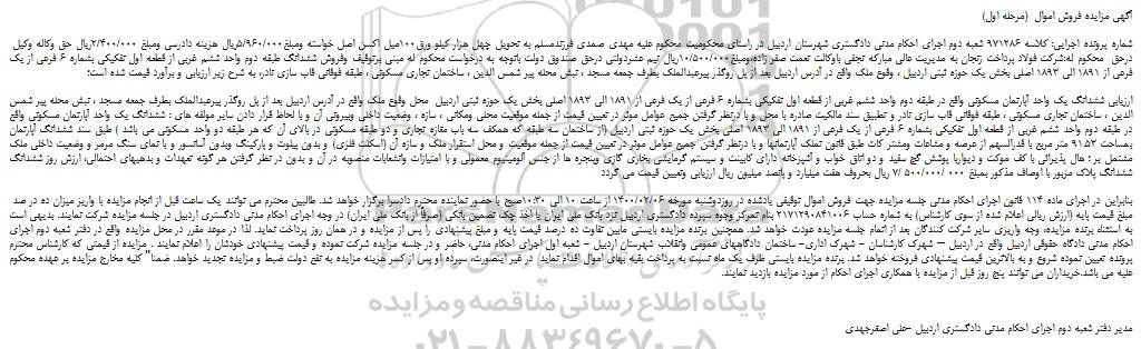 شماره پرونده اجرایی: کلاسه 971286 شعبه دوم اجرای احکام مدنی دادگستری شهرستان اردبیل در راستای محکومیت محکوم علیه مهدی صمدی فرزندمسلم به تحویل چهل هزار کیلو ورق100میل اکسن اصل خواسته ومبلغ5/960/000ریال هزینه دادرسی ومبلغ 2/400/000ریال حق وکاله وکیل درحق محکوم له:شرکت فولاد پرداخت زنجان به مدیریت عالی مبارکه نجفی باوکالت نعمت صفر زاده،ومبلغ10/500/000ریال نیم عشردولتی درحق صندوق دولت باتوجه به درخواست محکوم له مبنی برتوقیف وفروش ششدانگ طبقه دوم واحد ششم غربی از قطعه اول تفکیکی بشماره 6 فرعی از یک فرعی از 1891 الی 1893 اصلی بخش یک حوزه ثبتی اردبیل ، وقوع ملک واقع در آدرس اردبیل بعد از پل روگذر پیرعبدالملک بطرف جمعه مسجد ، نبش محله پیر شمس الدین ، ساختمان تجاری مسکونی ، طبقه فوقانی قاب سازی نادر، به شرح زیر ارزیابی و برآورد قیمت شده است؛