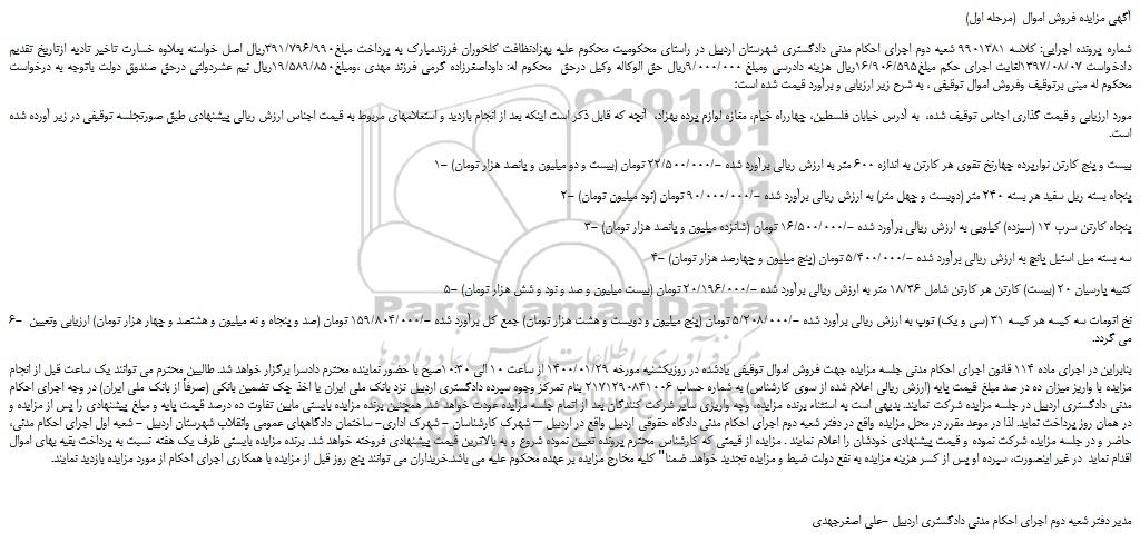 شماره پرونده اجرایی: کلاسه 9901381 شعبه دوم اجرای احکام مدنی دادگستری شهرستان اردبیل در راستای محکومیت محکوم علیه بهزادنظافت کلخوران فرزندمبارک به پرداخت مبلغ391/796/990ریال اصل خواسته بعلاوه خسارت تاخیر تادیه ازتاریخ تقدیم دادخواست 1397/08/07لغایت اجرای حکم مبلغ16/906/595ریال هزینه دادرسی ومبلغ 9/000/000ریال حق الوکاله وکیل درحق  محکوم له: داوداصغرزاده گرمی فرزند مهدی ،ومبلغ19/589/850ریال نیم عشردولتی درحق صندوق دولت باتوجه به درخواست محکوم له مبنی برتوقیف وفروش اموال توقیفی ، به شرح زیر ارزیابی و برآورد قیمت شده است؛