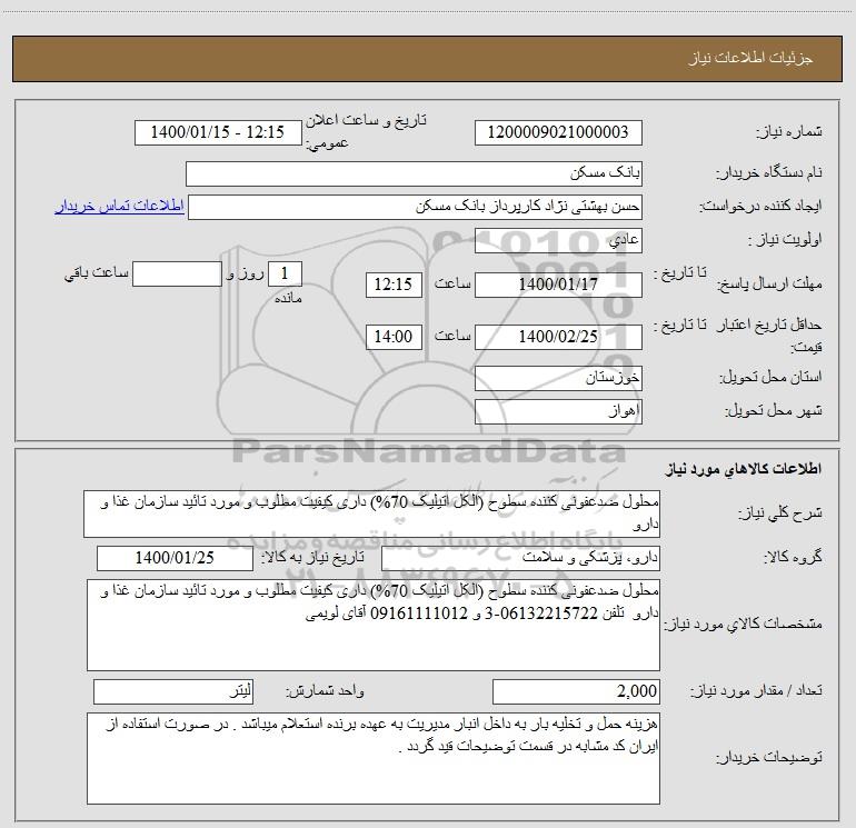 مشخصات کالای مورد نیاز: محلول ضدعفونی کننده سطوح (الکل اتیلیک 70%) داری کیفیت مطلوب و مورد تائید سازمان غذا و دارو تلفن 06132215722-3 و 09161111012 آقای لویمی