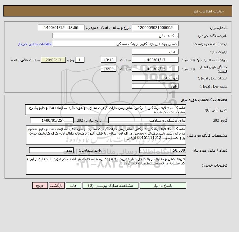 استعلام ماسک سه لایه پزشکی شرکتی تمام پرس دارای کیفیت مطلوب و مورد تائید سازمان غذا و دارو بشرح مشخصات ذکر شده , استعلام ماسک سه لایه پزشکی شرکتی تمام پرس دارای کیفیت مطلوب و مورد تائید سازمان غذا و دارو بشرح مشخصات ذکر شده