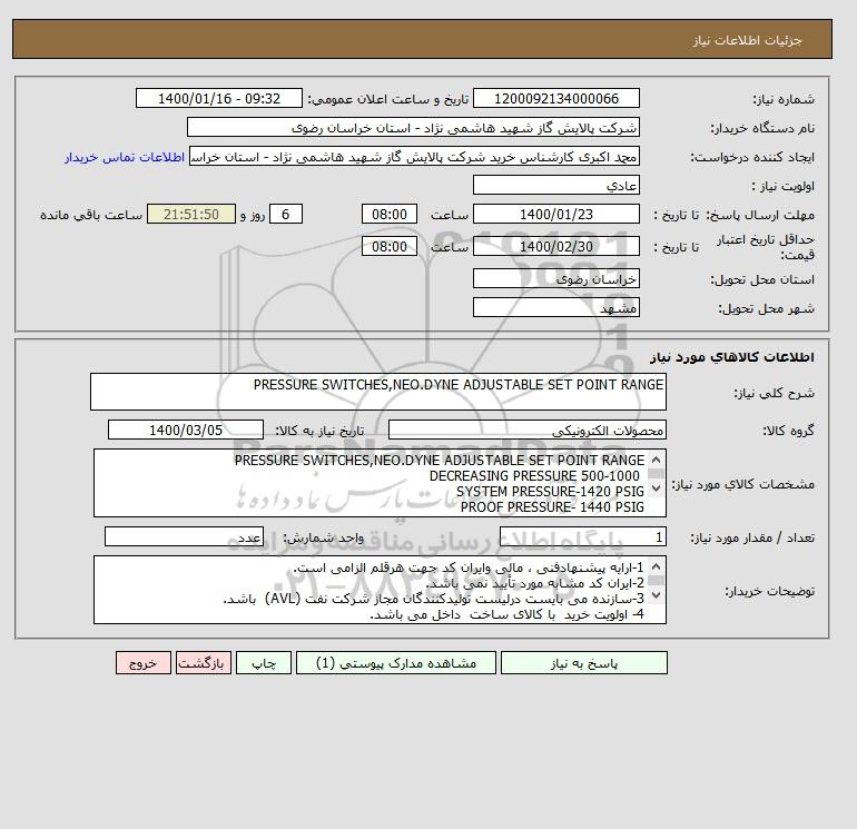 شرح کلی نیاز: PRESSURE SWITCHES,NEO.DYNE ADJUSTABLE SET POINT RANGE