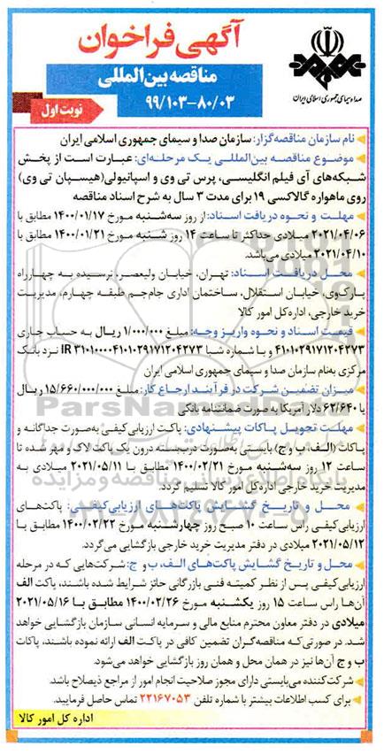 - موضوع مناقصه بین المللی یک مرحله ای: عبارت است از پخش شبکه های آی فیلم انگلیسی، پرس تی وی و اسپانیولی (هیسپان تی وی) روی ماهواره گالاکسی 19 برای مدت 3 سال به شرح اسناد مناقصه