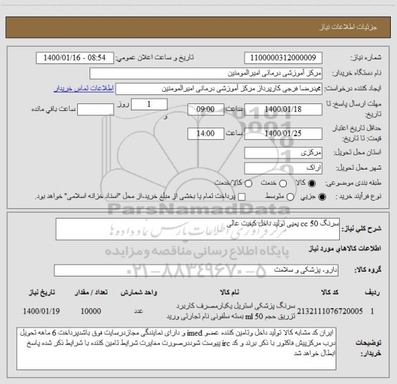 | 1 | 2132111076720005 | سرنگ پزشکی استریل یکبارمصرف کاربرد تزریق حجم 50 ml بسته سلفونی نام تجارتی ورید | عدد | 10000 | 1400/01/19 |