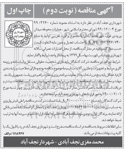 شهرداری نجف آباد در نظر دارد به استناد مصوبه شماره 3260/ 99 مورخ 99.12.4 شورای محترم اسلامی شهر، عملیات محوطه میدان ورودی غرب شهر نجف آباد را با مجموع برآورد تقریبی اولیه به مبلغ 79.127.246.740 ریال با احتساب تعدیل و بدون مابه التفاوت قیمت حسب مدارک موجود در مدارک مناقصه از محل ا اعتبارات عمرانی سالانه شهرداری و بر اساس فهرست بها سال ۹۹ به پیمانکار واجد شرایط واگذار نماید