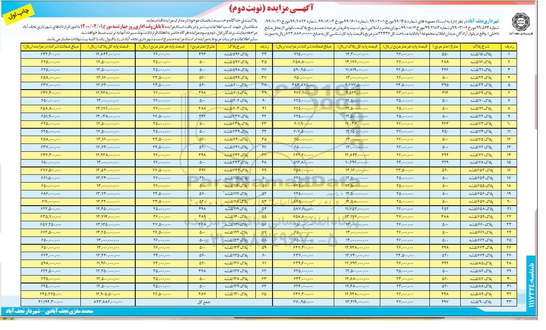 مزایده فروش شصت و پنج پلاک مسکونی نوبت دوم چاپ اول