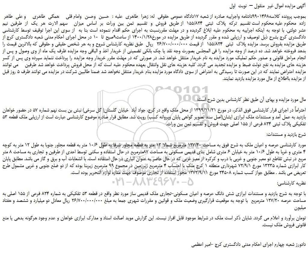 بموجب پرونده کلاسه9901468دادنامه واجراییه صادره از شعبه 17دادگاه عمومی حقوقی له: زهرا طاهری علیه : حسین وحسن وامام قلی همگی طاهری و علی طاهر زاده محکوم علیه محکوم است تقسیم ترکه پلاک ثبتی 155/824 از طریق فروش و تقسیم ثمن بین وراث بر اساس میزان سهم الارث هر یک از طرفین نیم عشر دولتی. با توجه به اینکه اجراییه به محکوم علیه ابلاغ گردیده و در مهلت مقررنسبت به اجرای حکم اقدام ننموده است بنا به از سوی این اجرا توقیف توسط کارشناسی دادگستری کرج بشرح ذیل توصیف و ارزیابی شده و مقرر گردیده از طریق مزایده در مورخ1400/1/28 از ساعت9صبح تا 10 در محل اجرای احکام مدنی شعبه دادگستری کرج از طریق مزایده بفروش برسد. مزایده پلاک ثبتی 155/824 از قیمت 26/700/000/000 ریال طبق نظریه کارشناس شروع و به هر شخص حقیقی و حقوقی که بالاترین قیمت را بدهد فروخته خواهد شد. ده درصد از وجه مزایده را فی المجلس بصورت وجه نقد یا چک بانکی تضمینی از خریدار اخذ و الباقی وجه مزایده ظرف یک ماه از وی وصول و پس از انجام مراحل قانونی و صدور حکم تملیک مورد مزایده به نام خریدار منتقل خواهد شد. در صورتی که در مهلت مقرر خریدار وجه مزایده را پرداخت ننماید سپرده وی پس از کسر هزینه های مزایده به نفع دولت ضبط و مزایده تجدید می گردد. کلیه هزینه های نقل وانتقال بعهده محکوم علیه است که از محل فروش پرداخت خواهد شد طرفین می توانند مزایده اعتراض نمایند که در این صورت تا رسیدگی به اعتراض از سوی دادگاه مورد مزایده بنام خریدار منتقل نخواهد شد ضمنا طالبین شرکت در مزایده می توانند ظرف 5 روز قبل از مزایده بااطلاع از مال مورد مزایده بازدید نمایند.