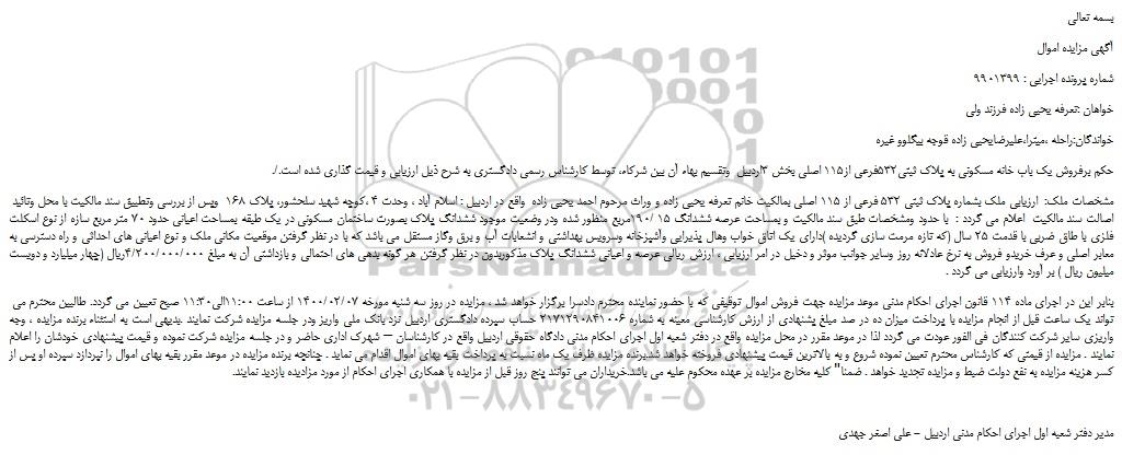 مشخصات ملک:  ارزیابی ملک بشماره پلاک ثبتی 532 فرعی از 115 اصلی بمالکیت خانم تعرفه یحیی زاده و وراث مرحوم احمد یحیی زاده  واقع در اردبیل : اسلام آباد ، وحدت 4 ،کوچه شهید سلحشور، پلاک 168  وپس از بررسی وتطبیق سند مالکیت با محل وتائید اصالت سند مالکیت  اعلام می گردد :  با حدود ومشخصات طبق سند مالکیت و بمساحت عرصه ششدانگ 15 /190مربع منظور شده ودر وضعیت موجود ششدانگ پلاک بصورت ساختمان مسکونی در یک طبقه بمساحت اعیانی حدود 70 متر مربع سازه از نوع اسکلت فلزی با طاق ضربی با قدمت 25 سال (که تازه مرمت سازی گردیده )دارای یک اتاق خواب وهال پذیرایی وآشپزخانه وسرویس بهداشتی و انشعابات آب و برق وگاز مستقل می باشد که با در نظر گرفتن موقعیت مکانی ملک و نوع اعیانی های احداثی و راه دسترسی به معابر اصلی و عرف خریدو فروش به نرخ عادلانه روز وسایر جوانب موثر و دخیل در امر ارزیابی ، ارزش ریالی عرصه و اعیانی ششدانگ پلاک مذکوربدون در نظر گرفتن هر گونه بدهی های احتمالی و بازداشتی آن به مبلغ 4/200/000/000ریال (چهار میلیارد و دویست میلیون ریال ) بر آورد وارزیابی می گردد .