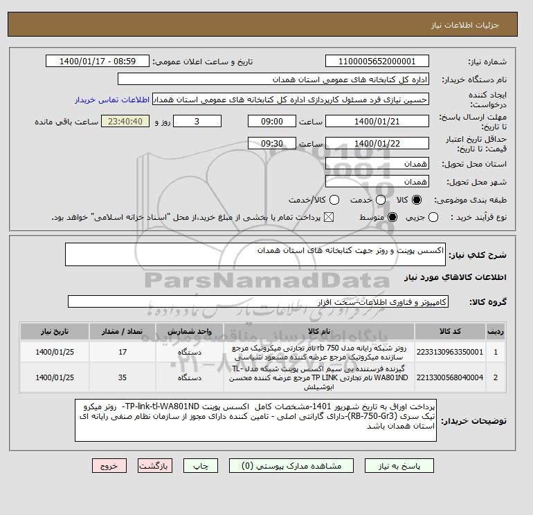 شرح کلی نیاز: اکسس پوینت و روتر جهت کتابخانه های استان همدان