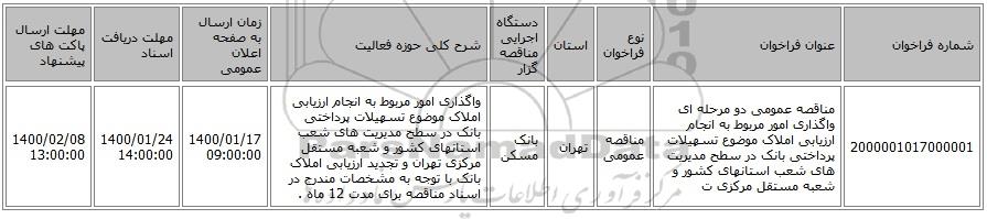 مناقصه، مناقصه عمومی دو مرحله ای واگذاری امور مربوط به انجام ارزیابی املاک موضوع تسهیلات پرداختی بانک در سطح مدیریت های شعب استانهای کشور و شعبه مستقل مرکزی ت, مناقصه عمومی دو مرحله ای واگذاری امور مربوط به انجام ارزیابی املاک موضوع تسهیلات پرداختی بانک در سطح مدیریت های شعب استانهای کشور و شعبه مستقل مرکزی ت