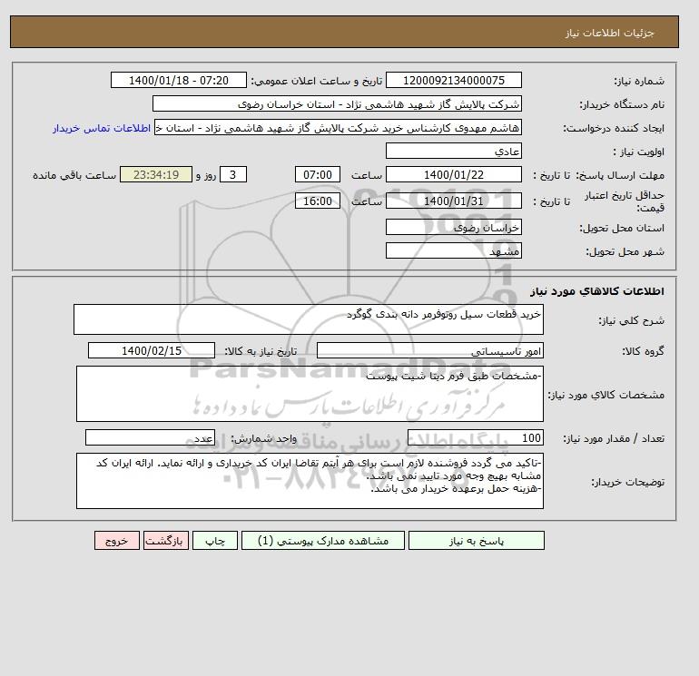نام دستگاه خریدار:شرکت پالایش گاز شهید هاشمی نژاد - استان خراسان رضوی