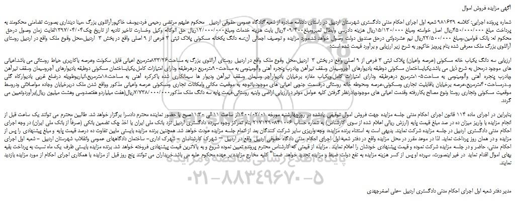 بنابراین در اجرای ماده 114 قانون اجرای احکام مدنی جلسه مزایده جهت فروش اموال توقیفی یادشده در روزچهارشنبه مورخه 1400/02/01از ساعت 11 الی 11:30صبح با حضور نماینده محترم دادسرا برگزار خواهد شد. طالبین محترم می توانند یک ساعت قبل از انجام مزایده با واریز میزان ده در صد مبلغ قیمت پایه (ارزش ریالی اعلام شده از سوی کارشناس) به شماره حساب 2171290841006 بنام تمرکز وجوه سپرده دادگستری اردبیل نزد بانک ملی ایران یا اخذ چک تضمین بانکی (صرفاً از بانک ملی ایران) در وجه اجرای احکام مدنی دادگستری اردبیل در جلسه مزایده شرکت نمایند. بدیهی است به استثناء برنده مزایده، وجه واریزی سایر شرکت کنندگان بعد از اتمام جلسه مزایده عودت خواهد شد. همچنین برنده مزایده بایستی مابین تفاوت ده درصد قیمت پایه و مبلغ پیشنهادی را پس از مزایده و در همان روز پرداخت نماید. لذا در موعد مقرر در محل مزایده واقع در دفتر شعبه اول اجرای احکام مدنی دادگاه حقوقی اردبیل واقع در اردبیل – شهرک کارشناسان - شهرک اداری- ساختمان دادگاههای عمومی وانقلاب شهرستان اردبیل - شعبه اول اجرای احکام مدنی، حاضر و در جلسه مزایده شرکت نموده و قیمت پیشنهادی خودشان را اعلام نمایند . مزایده از قیمتی که کارشناس محترم پرونده تعیین نموده شروع و به بالاترین قیمت پیشنهادی فروخته خواهد شد. برنده مزایده بایستی ظرف یک ماه نسبت به پرداخت بقیه بهای اموال اقدام نماید  در غیر اینصورت، سپرده او پس از کسر هزینه مزایده به نفع دولت ضبط و مزایده تجدید خواهد. ضمنا" کلیه مخارج مزایده بر عهده محکوم علیه می باشد.خریداران می توانند پنج روز قبل از مزایده با همکاری اجرای احکام از مورد مزایده بازدید نمایند.