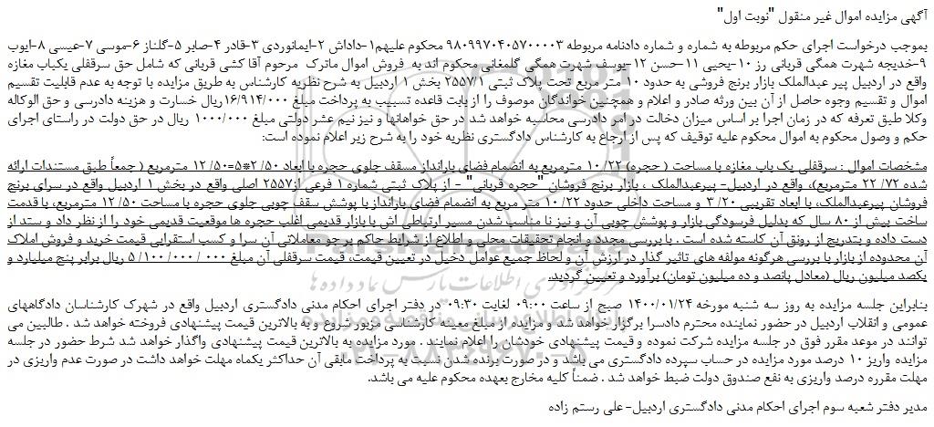 بموجب درخواست اجرای حکم مربوطه به شماره و شماره دادنامه مربوطه 9809970405700003 محکوم علیهم1-داداش 2-ایمانوردی 3-قادر 4-صابر 5-گلناز 6-موسی 7-عیسی 8-ایوب 9-خدیجه شهرت همگی قربانی رز 10-یحیی 11-حسن 12-یوسف شهرت همگی گلمغانی محکوم اند به فروش اموال ماترک مرحوم آقا کشی قربانی که شامل حق سرقفلی یکباب مغازه واقع در اردبیل پیر عبدالملک بازار برنج فروشی به حدود 10 متر مربع تحت پلاک ثبتی 2557/1 بخش 1 اردبیل به شرح نظریه کارشناس به طریق مزایده با توجه به عدم قابلیت تقسیم اموال و تقسیم وجوه حاصل از آن بین ورثه صادر و اعلام و همچنین خواندگان موصوف را از بابت قاعده تسبیب به پرداخت مبلغ 16/914/000ریال خسارت و هزینه دادرسی و حق الوکاله وکلا طبق تعرفه که در زمان اجرا بر اساس میزان دخالت در امر دادرسی محاسبه خواهد شد در حق خواهانها و نیز نیم عشر دولتی مبلغ 1000/000 ریال در حق دولت در راستای اجرای حکم و وصول محکوم به اموال محکوم علیه توقیف که پس از ارجاع به کارشناس دادگستری نظریه خود را به شرح زیر اعلام نموده است: