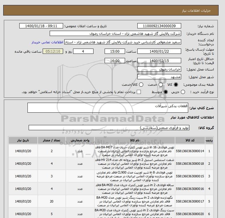 نام دستگاه خریدار:شرکت پالایش گاز شهید هاشمی نژاد - استان خراسان رضوی