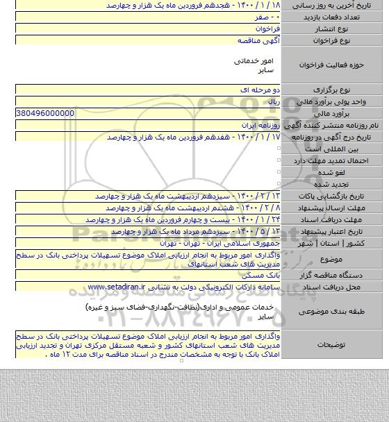 مناقصه, واگذاری امور مربوط به انجام ارزیابی املاک موضوع تسهیلات پرداختی بانک در سطح مدیریت های شعب استانهای از کلیه افراد متخصص و شرکتها واجد شرایط دعوت به عمل میآید در مناقصه با کد خبرگزاری پارس نماد: 3300694 شرکت نمایند.