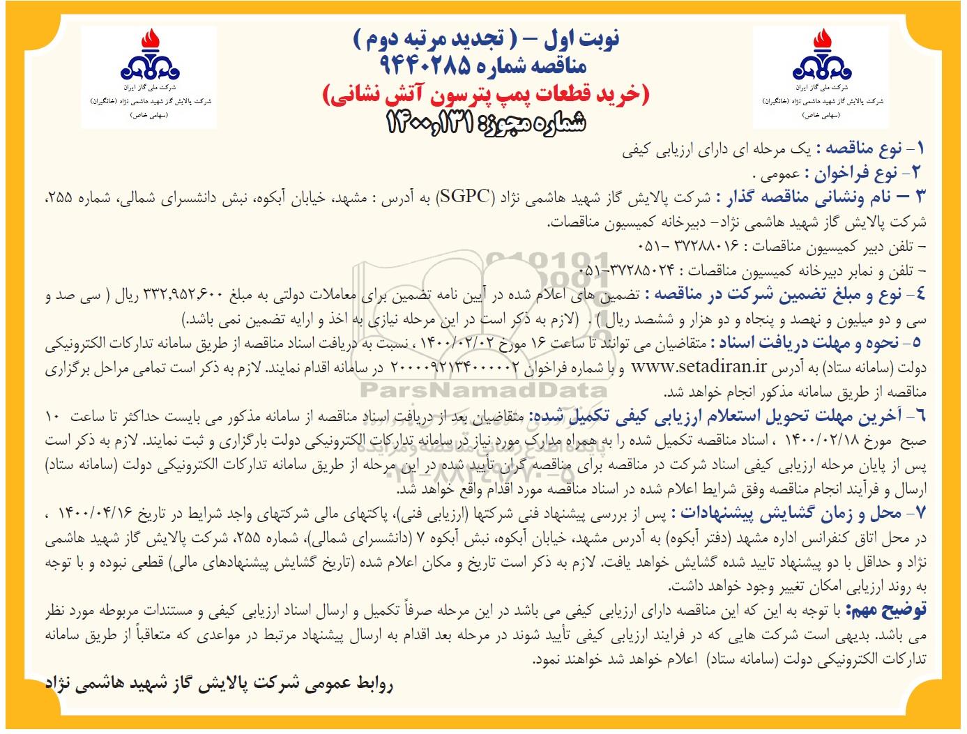 7- محل و زمان گشایش پیشنهادات: پس از بررسی پیشنهاد فنی شرکت‌ها (ارزیابی فنی)، پاکت‌های مالی شرکت‌های واجد شرایط در تاریخ 1400.2.16 ، در محل اتاق کنفرانس اداره مشهد (دفتر آبکوه) به آدرس مشهد، خیابان آبکوه، نبش دانشسرای شمالی، شماره 255، شرکت پالایش گاز شهید هاشمی نژاد و حداقل با سه پیشنهاد تأیید شده گشایش خواهد یافت. لازم به ذکر است تاریخ و مکان اعلام شده (تاریخ گشایش پیشنهادهای مالی) قطعی نبوده و با توجه به روند ارزیابی امکان تغییر وجود خواهد داشت.