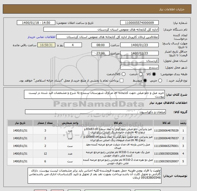 شرح کلی نیاز: خرید مبل و جلو مبلی جهت کتابخانه ای مرکزی شهرستان سنندج به شرح و مشخصات قید شده در لیست پیوست