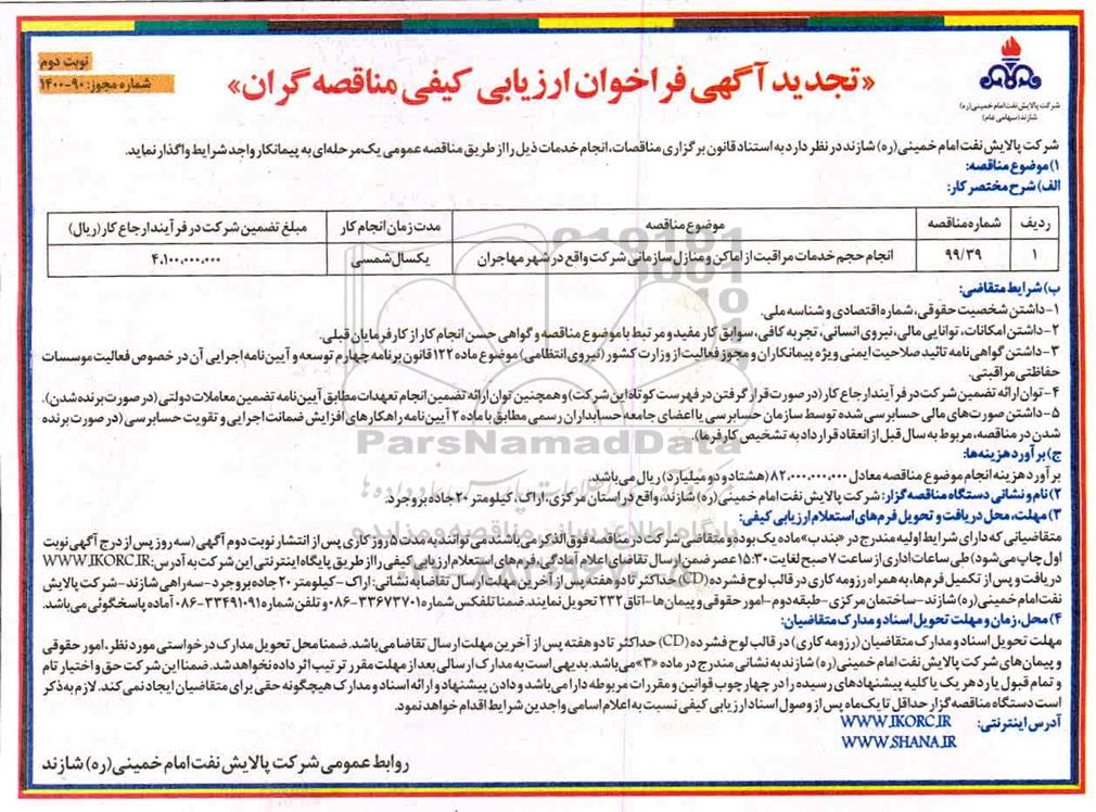 99/39 انجام حجم خدمات مراقبت از اماکن و منازل سازمانی شرکت واقع در شهر مهاجران
