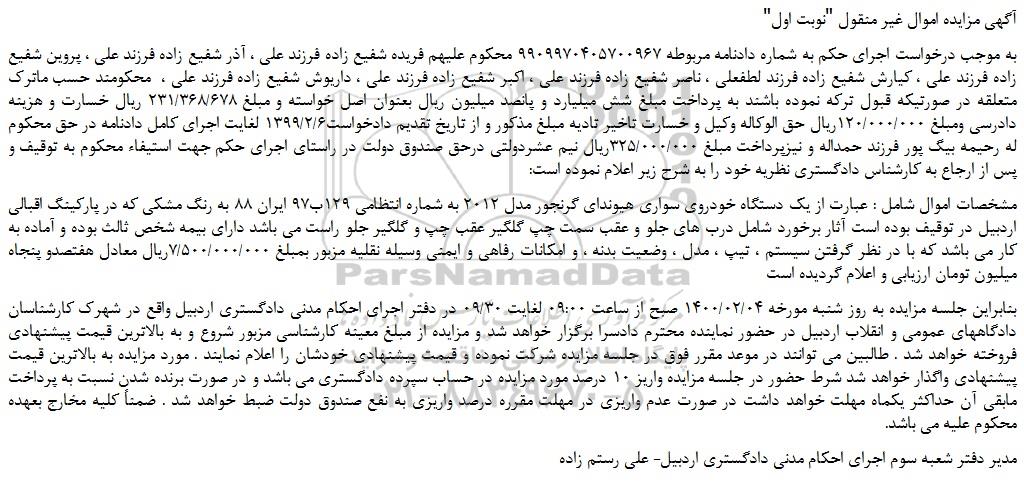 مشخصات اموال شامل : عبارت از یک دستگاه خودروی سواری هیوندای گرنجور مدل 2012 به شماره انتظامی 129ب97 ایران 88 به رنگ مشکی که در پارکینگ اقبالی اردبیل در توقیف بوده است آثار برخورد شامل درب های جلو و عقب سمت چپ گلگیر عقب چپ و گلگیر جلو راست می باشد دارای بیمه شخص ثالث بوده و آماده به کار می باشد که با در نظر گرفتن سیستم ، تیپ ، مدل ، وضعیت بدنه ، و امکانات رفاهی و ایمنی وسیله نقلیه مزبور بمبلغ 7/500/000/000ریال معادل هفتصدو پنجاه میلیون تومان ارزیابی و اعلام گردیده است