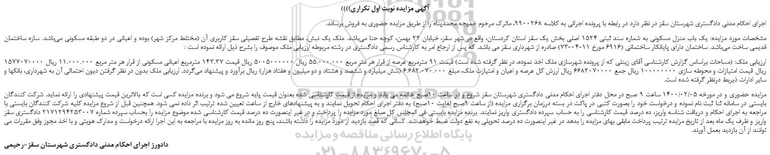 اجرای احکام مدنی دادگستری شهرستان سقز در نظر دارد در رابطه با پرونده اجرائی به کلاسه 9900268، ماترک مرحوم خدیجه محمدپناه را از طریق مزایده حضوری به فروش برساند.