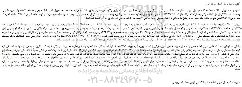 شماره پرونده اجرایی: کلاسه 9900675 شعبه اول اجرای احکام مدنی دادگستری شهرستان اردبیل در راستای محکومیت عزت اله یاری ینگجه فرزندمصیب به پرداخت  به مبلغ2/000/000/000ریال اصل خواسته ومبلغ 135/500/000ریال هزینه دادرسی ومبلغ72/000/000ریال حق الوکاله وکیل وخسارت تاخیر تادیه از 1396/05/11لغایت اجرای حکم درحق محکوم له وحید حمیدی آلوچه ومبلغ 100/000/000ریال نیم عشر دولتی درحق صندوق دولت،مورد مزایده و توصیف اجمالی آن: ششدانگ یکبابخانه پلاک صفر فرعی از 4456اصلی واقع در بخش یک اردبیل ،محل وقوع ملک واقع در اردبیل شریعتی کوچه اسلامی 3 جنب عمارت نیما به شرح زیر ارزیابی و برآورد قیمت شده است؛