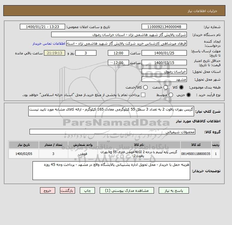 نام دستگاه خریدار:شرکت پالایش گاز شهید هاشمی نژاد - استان خراسان رضوی