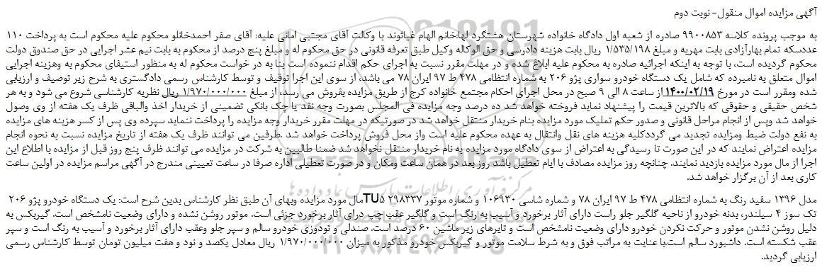به موجب پرونده کلاسه 9900853 صادره از شعبه اول دادگاه خانواده شهرستان هشتگرد لها:خانم الهام غیاثوند با وکالت آقای مجتبی امانی علیه: آقای صفر احمدخانلو محکوم علیه محکوم است به پرداخت 110 عددسکه تمام بهارآزادی بابت مهریه و مبلغ 1/535/198 ریال بابت هزینه دادرسی و حق الوکاله وکیل طبق تعرفه قانونی در حق محکوم له و مبلغ پنج درصد از محکوم به بابت نیم عشر اجرایی در حق صندوق دولت محکوم گردیده است، با توجه به اینکه اجرائیه صادره به محکوم علیه ابلاغ شده و در مهلت مقرر نسبت به اجرای حکم اقدام ننموده است بنا به در خواست محکوم له به منظور استیفای محکوم به وهزینه اجرایی اموال متعلق به نامبرده که شامل یک دستگاه خودرو سواری پژو 206 به شماره انتظامی 478 ط 97 ایران 78 می باشد، از سوی این اجرا توقیف و توسط کارشناس رسمی دادگستری به شرح زیر توصیف و ارزیابی شده ومقرر است در مورخ 1400/02/19 از ساعت 8 الی 9 صبح در محل اجرای احکام مجتمع خانواده کرج از طریق مزایده بفروش می رسد، از مبلغ 1/970/000/000 ریال نظریه کارشناسی شروع می شود و به هر شخص حقیقی و حقوقی که بالاترین قیمت را پیشنهاد نماید فروخته خواهد شد ده درصد وجه مزایده فی المجلس بصورت وجه نقد یا چک بانکی تضمینی از خریدار اخذ والباقی ظرف یک هفته از وی وصول خواهد شد وپس از انجام مراحل قانونی و صدور حکم تملیک مورد مزایده بنام خریدار منتقل خواهد شد در صورتیکه در مهلت مقرر خریدار وجه مزایده را پرداخت ننماید سپرده وی پس از کسر هزینه های مزایده به نفع دولت ضبط ومزایده تجدید می گرددکلیه هزینه های نقل وانتقال به عهده محکوم علیه است واز محل فروش پرداخت خواهد شد .طرفین می توانند ظرف یک هفته از تاریخ مزایده نسبت به نحوه انجام مزایده اعتراض نمایند که در این صورت تا رسیدگی به اعتراض از سوی دادگاه مورد مزایده به نام خریدار منتقل نخواهد شد ضمنا طالبین به شرکت در مزایده می توانند ظرف پنج روز قبل از مزایده با اطلاع این اجرا از مال مورد مزایده بازدید نمایند. چنانچه روز مزایده مصادف با ایام تعطیل باشد روز بعد در همان ساعت ومکان و در صورت تعطیلی اداره صرفا در ساعت تعیینی مندرج در آگهی مراسم مزایده در اولین ساعت کاری بعد از آن برگزار خواهد شد.