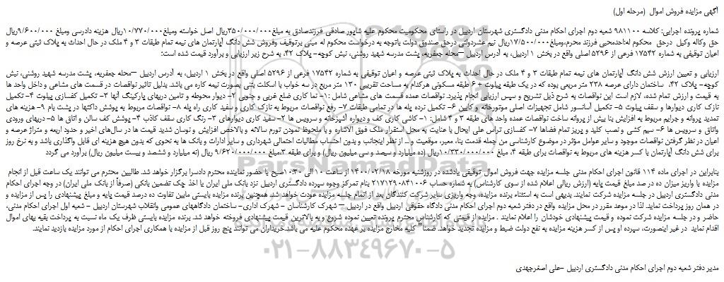 شماره پرونده اجرایی: کلاسه 981100 شعبه دوم اجرای احکام مدنی دادگستری شهرستان اردبیل در راستای محکومیت محکوم علیه شاپور صادقی فرزندصادق به مبلغ350/000/000ریال اصل خواسته ومبلغ10/770/000ریال هزینه دادرسی ومبلغ 9/600/000ریال حق وکاله وکیل درحق محکوم له:احدمحبی فرزند محرم،ومبلغ17/500/000ریال نیم عشردولتی درحق صندوق دولت باتوجه به درخواست محکوم له مبنی برتوقیف وفروش شش دانگ آپارتمان های نیمه تمام طبقات 3 و 4 ملک در حال احداث به پلاک ثبتی عرصه و اعیان توقیفی به شماره 17542 فرعی از 5296 اصلی واقع در بخش 1 اردبیل، به آدرس اردبیل –محله جعفریه، پشت مدرسه شهید روشنی، نبش کوچه- پلاک 42، به شرح زیر ارزیابی و برآورد قیمت شده است؛