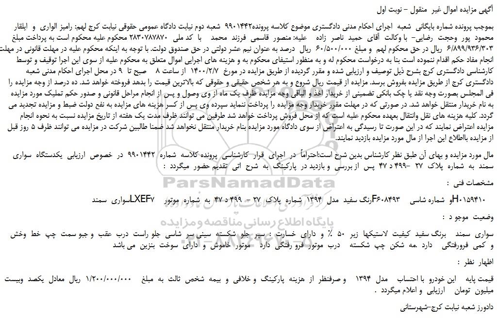 مال مورد مزایده و بهای آن طبق نظر کارشناس بدین شرح است:احتراماً در اجرای قرار کارشناسی پرونده کلاسه شماره 9901442 در خصوص ارزیابی یکدستگاه سواری سمند به شماره پلاک 27 -499 د 47 پس از بررسی و بازدید در پارکینگ به شرح اتی تقدیم حضور میگردد :