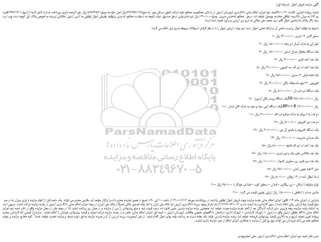 بنابراین در اجرای ماده 114 قانون اجرای احکام مدنی جلسه مزایده جهت فروش اموال توقیفی یادشده در روزیکشنبه مورخه 1400/02/12 از ساعت 10 الی 10:30صبح با حضور نماینده محترم دادسرا برگزار خواهد شد. طالبین محترم می توانند یک ساعت قبل از انجام مزایده با واریز میزان ده در صد مبلغ قیمت پایه (ارزش ریالی اعلام شده از سوی کارشناس) به شماره حساب 2171290841006 بنام تمرکز وجوه سپرده دادگستری اردبیل نزد بانک ملی ایران یا اخذ چک تضمین بانکی (صرفاً از بانک ملی ایران) در وجه اجرای احکام مدنی دادگستری اردبیل در جلسه مزایده شرکت نمایند. بدیهی است به استثناء برنده مزایده، وجه واریزی سایر شرکت کنندگان بعد از اتمام جلسه مزایده عودت خواهد شد. همچنین برنده مزایده بایستی مابین تفاوت ده درصد قیمت پایه و مبلغ پیشنهادی را پس از مزایده و در همان روز پرداخت نماید. لذا در موعد مقرر در محل مزایده واقع در دفتر شعبه دوم اجرای احکام مدنی دادگاه حقوقی اردبیل واقع در اردبیل – شهرک کارشناسان - شهرک اداری- ساختمان دادگاههای عمومی وانقلاب شهرستان اردبیل - شعبه اول اجرای احکام مدنی، حاضر و در جلسه مزایده شرکت نموده و قیمت پیشنهادی خودشان را اعلام نمایند . مزایده از قیمتی که کارشناس محترم پرونده تعیین نموده شروع و به بالاترین قیمت پیشنهادی فروخته خواهد شد. برنده مزایده بایستی ظرف یک هفته نسبت به پرداخت بقیه بهای اموال اقدام نماید  در غیر اینصورت، سپرده او پس از کسر هزینه مزایده به نفع دولت ضبط و مزایده تجدید خواهد. ضمنا" کلیه مخارج مزایده بر عهده محکوم علیه می باشد.خریداران می توانند پنج روز قبل از مزایده با همکاری اجرای احکام از مورد مزایده بازدید نمایند.