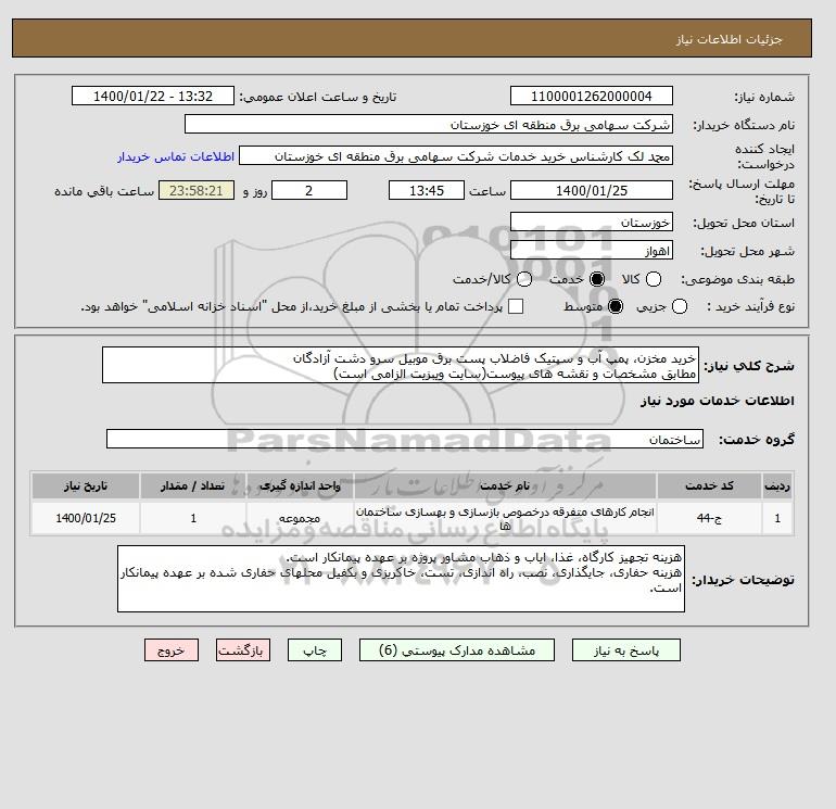 شرح کلی نیاز: خرید مخزن، پمپ آب و سپتیک فاضلاب پست برق موبیل سرو دشت آزادگان