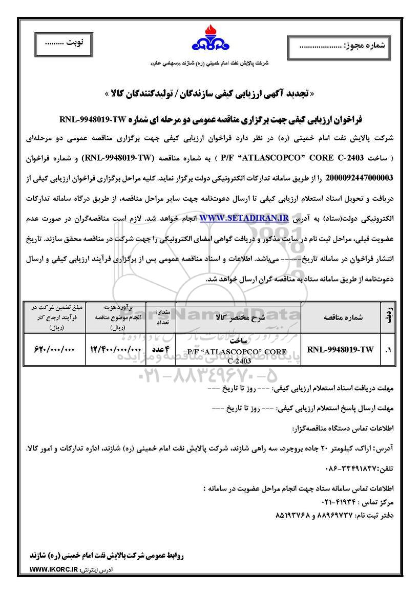 شرکت پالایش نفت امام خمینی (ره) در نظر دارد فراخوان ارزیابی کیفی جهت برگزاری مناقصه عمومی دو مرحله ای ساخت P/F ATLASCOPCO CORE C-2403 به شماره RNL- 9948019-TW و شماره فراخوان 2000092447000003 را از طریق سامانه تدارکات الکترونیکی دولت برگزار نماید کلیه مراحل برگزاری فراخوان ارزیابی کیفی از دریافت و تحویل اسناد استعلام ارزیابی کیفی تا ارسال دعوت نامه جهت سایر مراحل مناقصه از طریق درگاه سامانه تدارکات الکترونیکی دولت ستاد به آدرس ستاد ایران انجام خواهد شد لازم است مناقصه گران در صورت عدم عضویت قبلی مراحل ثبت نام در سایت مذکور و دریافت گواهی امضای الکترونیکی ار جهت شرکت در مناقصه محقق سازند تاریخ انتشار فراخوان در سامانه تاریخ ..... می باشد اطلاعات و اسناد مناقصه عمومی پس از برگزاری فرایند ارزیابی کیفی و ارسال دعوتنامه از طریق سامانه ستاد به مناقصه گران ارسال خواهد شد