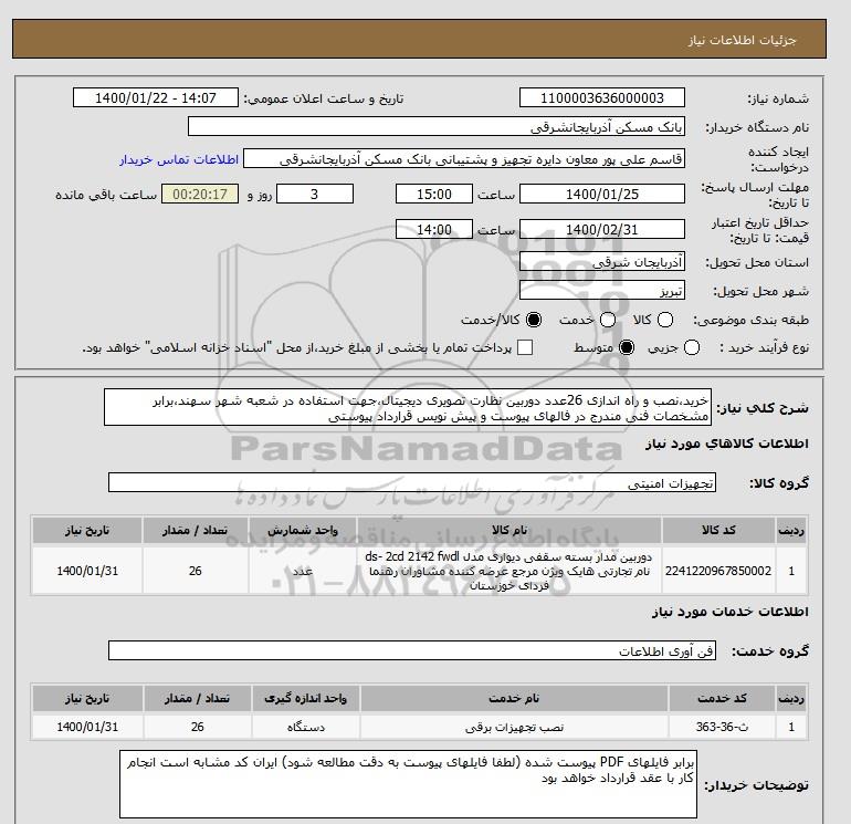استعلام خرید،نصب و راه اندازی 26عدد دوربین نظارت تصویری دیجیتال،جهت استفاده در شعبه شهر سهند،برابر مشخصات فنی مندرج در فالهای پیوست و پیش نویس قرارداد پیوستی, استعلام خرید،نصب و راه اندازی 26عدد دوربین نظارت تصویری دیجیتال،جهت استفاده در شعبه شهر سهند،برابر مشخصات فنی مندرج در فالهای پیوست و پیش نویس قرارداد پیوستی