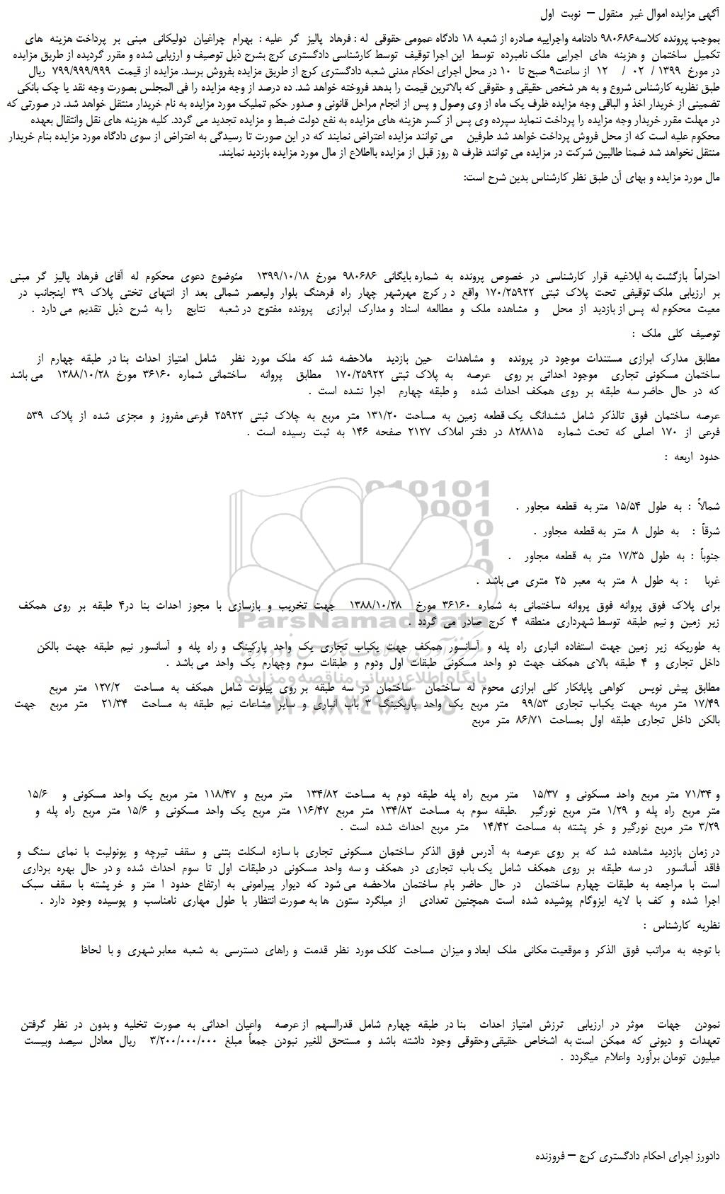 بموجب پرونده کلاسه980686 دادنامه واجراییه صادره از شعبه 18 دادگاه عمومی حقوقی  له : فرهاد  پالیز  گر  علیه :  بهرام  چراغیان  دولیکانی  مبنی  بر  پرداخت هزینه  های  تکمیل  ساختمان  و هزینه  های  اجرایی  ملک نامبرده  توسط  این اجرا توقیف  توسط کارشناسی دادگستری کرج بشرح ذیل توصیف و ارزیابی شده و مقرر گردیده از طریق مزایده در مورخ  1399 /  02  /    12  از ساعت9 صبح تا  10 در محل اجرای احکام مدنی شعبه دادگستری کرج از طریق مزایده بفروش برسد. مزایده از قیمت  799/999/999  ریال  طبق نظریه کارشناس شروع و به هر شخص حقیقی و حقوقی که بالاترین قیمت را بدهد فروخته خواهد شد. ده درصد از وجه مزایده را فی المجلس بصورت وجه نقد یا چک بانکی تضمینی از خریدار اخذ و الباقی وجه مزایده ظرف یک ماه از وی وصول و پس از انجام مراحل قانونی و صدور حکم تملیک مورد مزایده به نام خریدار منتقل خواهد شد. در صورتی که در مهلت مقرر خریدار وجه مزایده را پرداخت ننماید سپرده وی پس از کسر هزینه های مزایده به نفع دولت ضبط و مزایده تجدید می گردد. کلیه هزینه های نقل وانتقال بعهده محکوم علیه است که از محل فروش پرداخت خواهد شد طرفین    می توانند مزایده اعتراض نمایند که در این صورت تا رسیدگی به اعتراض از سوی دادگاه مورد مزایده بنام خریدار منتقل نخواهد شد ضمنا طالبین شرکت در مزایده می توانند ظرف 5 روز قبل از مزایده بااطلاع از مال مورد مزایده بازدید نمایند.