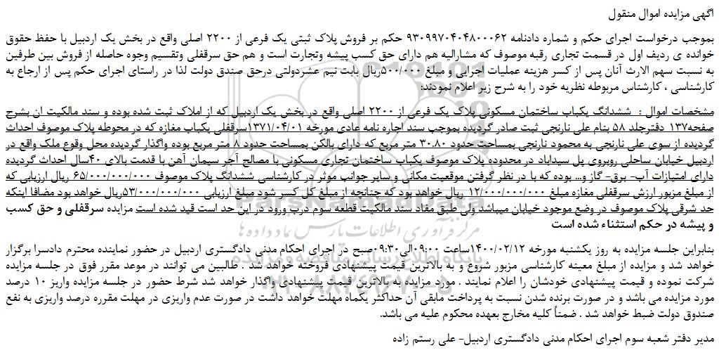 بموجب درخواست اجرای حکم و شماره دادنامه 9309970404800062 حکم بر فروش پلاک ثبتی یک فرعی از 2200 اصلی واقع در بخش یک اردبیل با حفظ حقوق خوانده ی ردیف اول در قسمت تجاری رقبه موصوف که مشارالیه هم دارای حق کسب پیشه وتجارت است و هم حق سرقفلی وتقسیم وجوه حاصله از فروش بین طرفین به نسبت سهم الارث آنان پس از کسر هزینه عملیات اجرایی و مبلغ 500/000ریال بابت نیم عشردولتی درحق صندق دولت لذا در راستای اجرای حکم پس از ارجاع به کارشناسی ، کارشناس مربوطه نظریه خود را به شرح زیر اعلام نمودند: