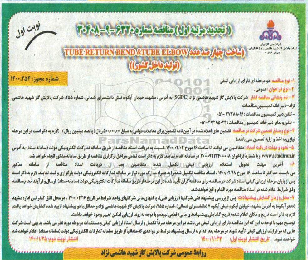 تجدید مناقصه ساخت چهارصد عدد TUBE RETURN BEND & TUBE ELBOW از کلیه افراد متخصص و شرکتها واجد شرایط دعوت به عمل میآید در مناقصه با کد خبرگزاری پارس نماد: 3315783 شرکت نمایند.