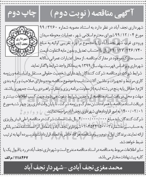 شهرداری نجف آباد در نظر دارد به استناد مصوبه شماره 3260/ 99 مورخ 99.12.4 شورای محترم اسلامی شهر، عملیات محوطه میدان ورودی غرب شهر نجف آباد را با مجموع برآورد تقریبی اولیه به مبلغ 79.127.246.740 ریال با احتساب تعدیل و بدون مابه التفاوت قیمت حسب مدارک موجود در مدارک مناقصه از محل ا اعتبارات عمرانی سالانه شهرداری و بر اساس فهرست بها سال ۹۹ به پیمانکار واجد شرایط واگذار نماید