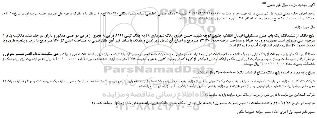 واحد اجرای احکام مدنی شعبه اول شهرستان مراغه جهت اجرای دادنامه 9409974149100630 شعبه 2 دادگاه عمومی (حقوقی) مراغه شماره بایگانی970136/ج.م 1 در نظر دارد ماترک مرحوم علی فیروزی جلسه مزایده ای در تاریخ18/ 02/ 1400 روزشنبه ساعت 10 صبح در محل اجرای احکام دادگستری مراغه اموال با مشخصات ذیل برگزار نماید .